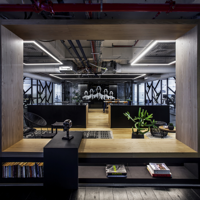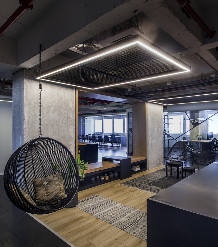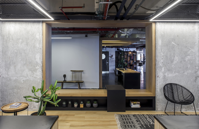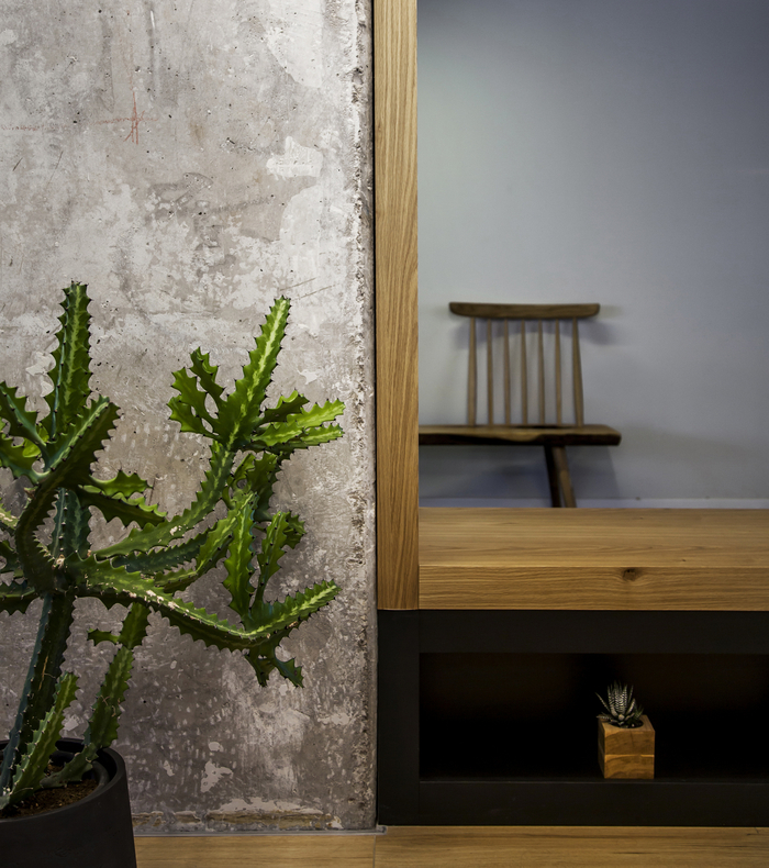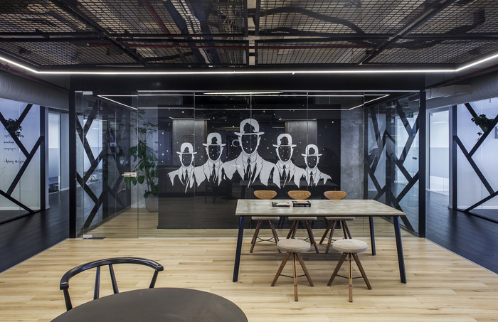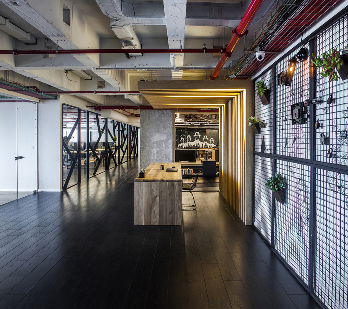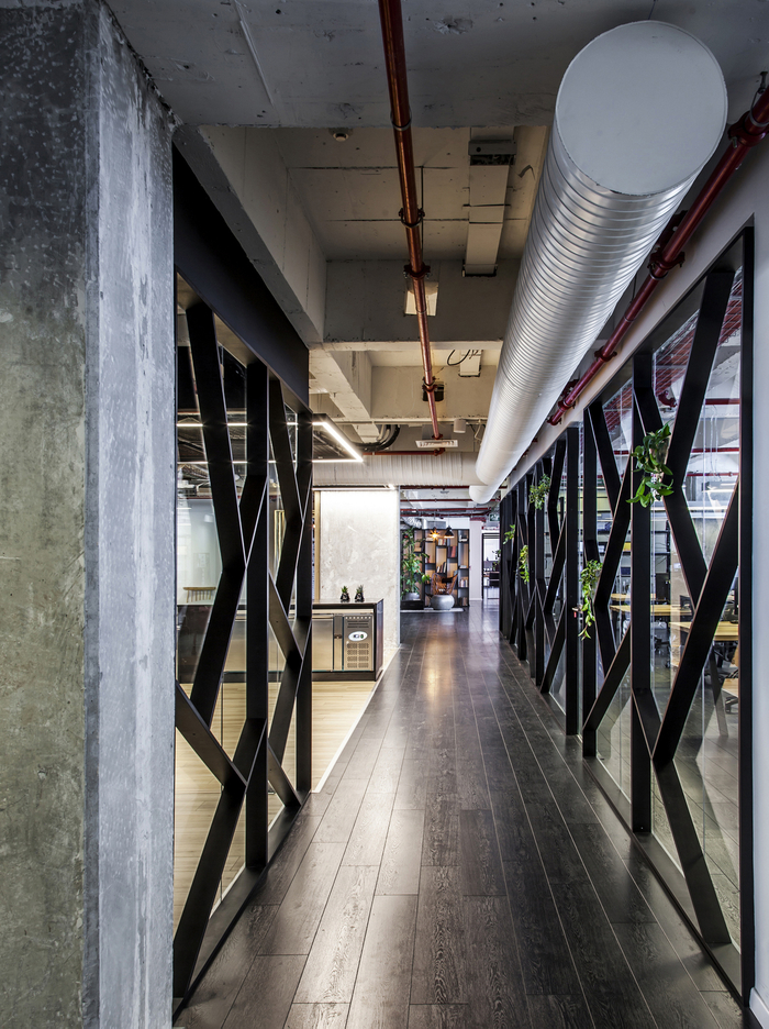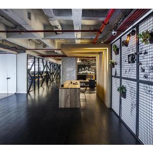 面(miàn)積500m2,本方案采用工業風格,地面(miàn)采用複合木地闆用幾種(zhǒng)不同顔色,以此來區分辦公區域,更顯有特色。頂面(miàn)主要爲原頂刷膠水,配有鐵絲網材質顯示其頂面(miàn)的多樣性,牆面(miàn)爲部分原牆刷膠,部分白色及飾面(miàn)闆裝飾。整體效果統一亦時尚,展示了企業的形象美。