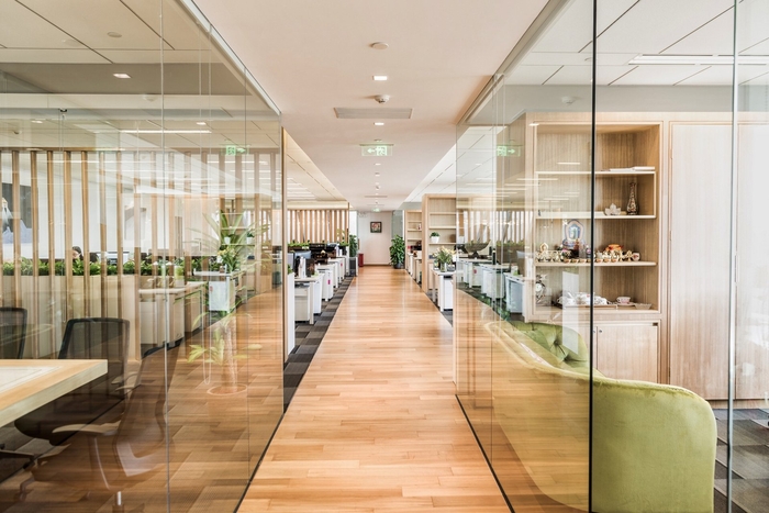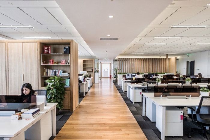 面(miàn)積:1500m2,本方案運用現代時尚風格,材質多爲木飾紋材質和鋼化玻璃,整個辦公環境透明化,有助于工作的互相合作與溝通。